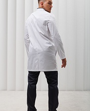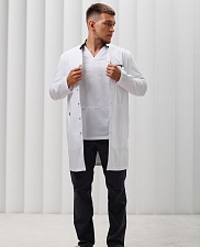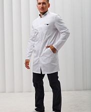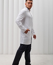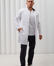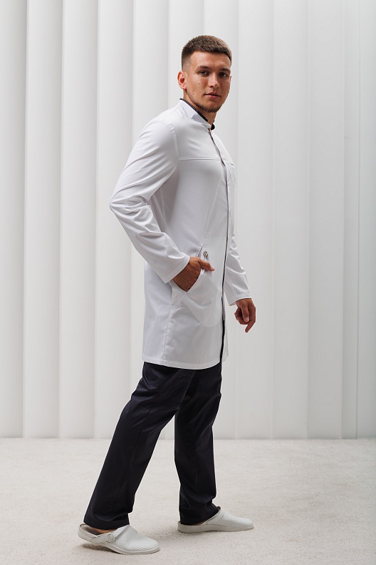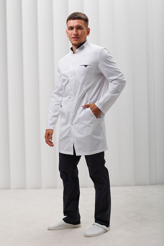 CP163 А - красивый мужской мед халат. Он имеет прямой силуэт и застежку на кнопках, что обеспечивает комфортную посадку и легкость надевания. Боковые швы халата оснащены разрезами, что обеспечивает удобный доступ к содержимому карманов брюк. Также на спинке имеется шлица, которая добавляет дополнительное удобство при движении. Халат оборудован двумя боковыми карманами и нагрудным карманом, что позволяет удобно хранить необходимые предметы. Модный воротник-стойка придает халату элегантный вид. Горловина обработана контрастным кантом, который не только защищает от истирания, но и придает изюминку дизайну. Длинные рукава халата обеспечивают защиту и комфорт во время работы. Эластичная ткань с высоким содержанием хлопка делает халат мягким и приятным на ощупь. Мужской медицинский халат CP163 А - идеальный выбор для стильных и заботливых докторов.