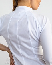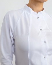 Халат отличается элегантным воротником-стойкой, придающим образу особую изящность. Материал - сочетание ткани Ламея с ложной трикотажной сеткой, которое позволяет коже дышать, отводит влагу и обеспечивает комфорт при интенсивной работе.