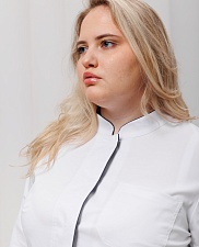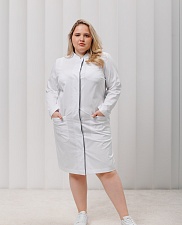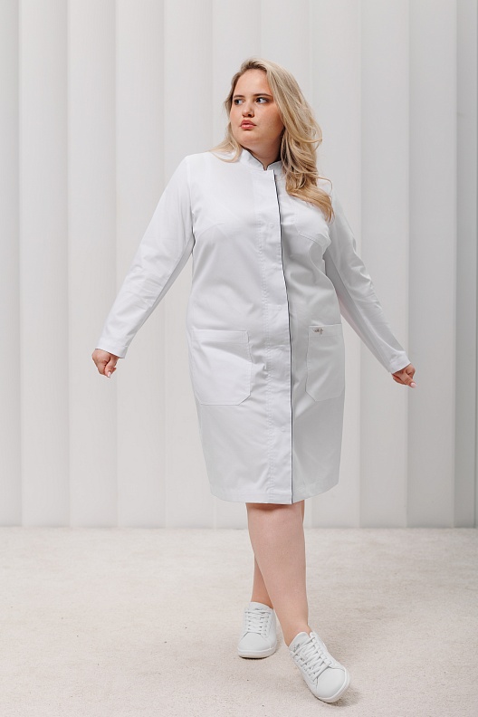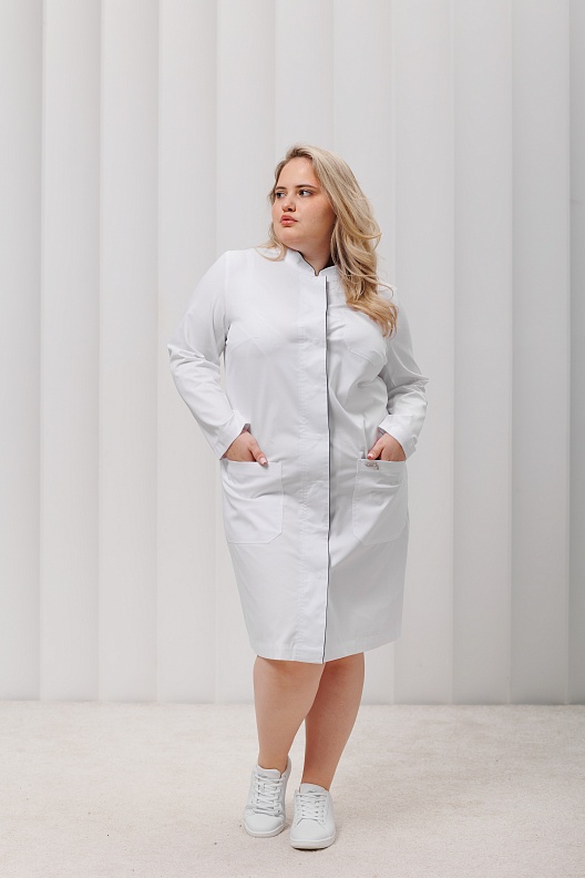 Медицинский халат имеет два вместительных кармана по бокам и один нагрудный. Внутренняя деталь воротника и нижняя деталь правого борта выполнены из отделочной ткани. Отделка может быть как в тон основного цвета, так и контрастным цветом.