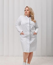 Женский халат больших размеров с длинным рукавом A200Б А идеально дополнит образ медицинского сотрудника. Практичная застежка на потайных кнопках прослужит долгое время. Прямой силуэт и воротник-стойка создают элегантный образ. Полупояса на спинке позволяют менять силуэт, регулировать линию талии.