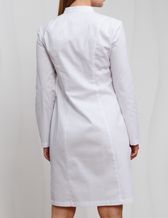 Левая сторона переда с отрезной кокеткой , рельефом от кокетки до низа изделия. В шве кокетки расположена петля для крепления бейджа. Вместительные карманы для хранения медицинских принадлежностей. Воротник стойка. Рукава имеют две длины: 3/4 и длинный.