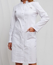 Халат женский, приталенный с застежкой по планке на девять металлических кнопок и элегантными разрезами в боковых швах.