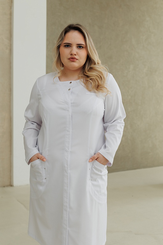 Халат имеет боковые карманы с наклонным входом, что позволяет удобно хранить необходимые медицинские инструменты или личные вещи.