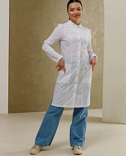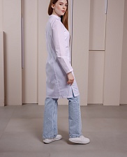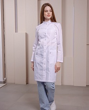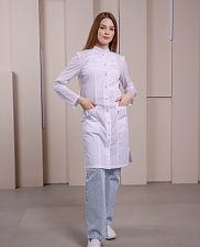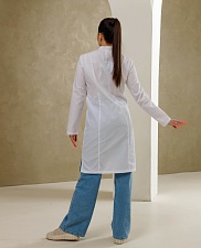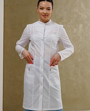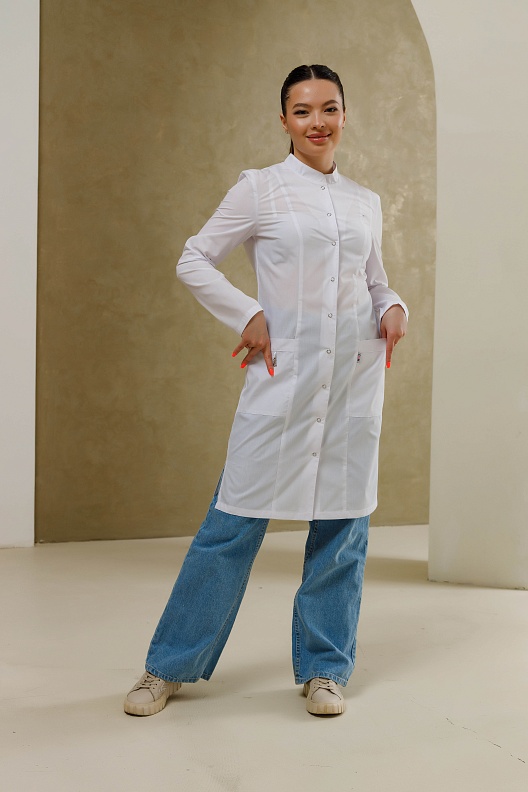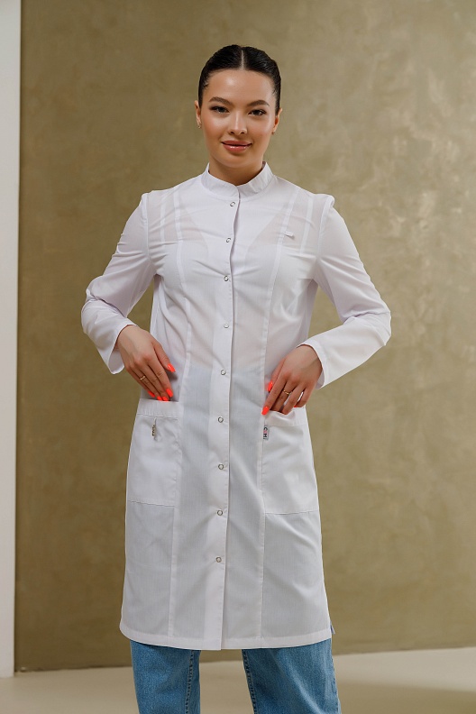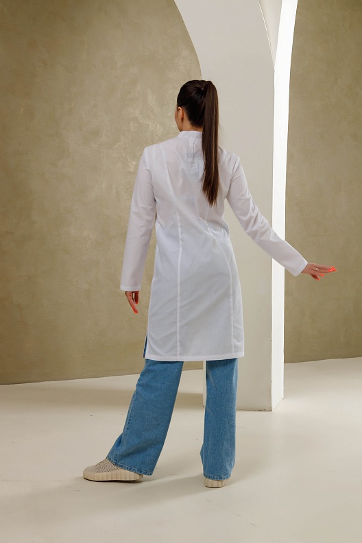 Медицинский халат полуприлегающего силуэта с воротником-стойкой и застежкой на кнопки. Халат имеет разрезы по боковым швам, что обеспечивает комфортную посадку. Передняя часть халата украшена рельефами, начиная от плечевого шва и до низа изделия, а боковые карманы выполнены в рельефном шве с имитацией планки. На правом кармане расположена петля с подвеской, а на левой стороне, на уровне груди, вшита шлевка для бейджа. Дополнительно, на уровне кармана, вставлен флажок. Спинка халата также украшена рельефами от плечевого шва до низа изделия. Рукав длинный.