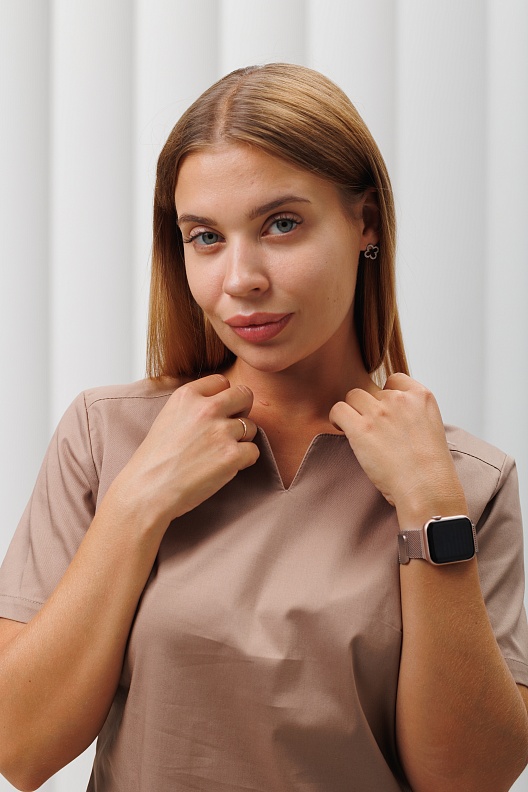 Женская хирургичка полуприлегающего силуэта. Фигурная горловина красиво подчеркивает линию шеи. Нагрудные, плечевые и талиевые вытачки обеспечивают идеальную посадку модели по фигуре.