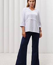 Куртка женская, прямого силуэта, без застежки. Горловина У-образной формы, обработана воротником стойкой. Перед состоит из двух частей: верхней и нижней. Верхняя часть переда с нагрудными вытачками. Нижняя часть с имитацией центральной застежки. В боковые швы нижняя часть переда не входит, открывая свободный доступ к боковым карманам брюк.Спинка с отрезной кокеткой, переходящей на перед и средним швом.Рукава одношовные, втачные. Длина рукава ¾. Низ рукава обработан притачной манжетой, которая отворачивается на рукав.